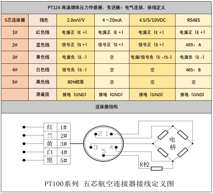 | 温度:J、K、E、PT100 | 电气连接 | 5芯/6芯航空连接器电气连接出线 | |
